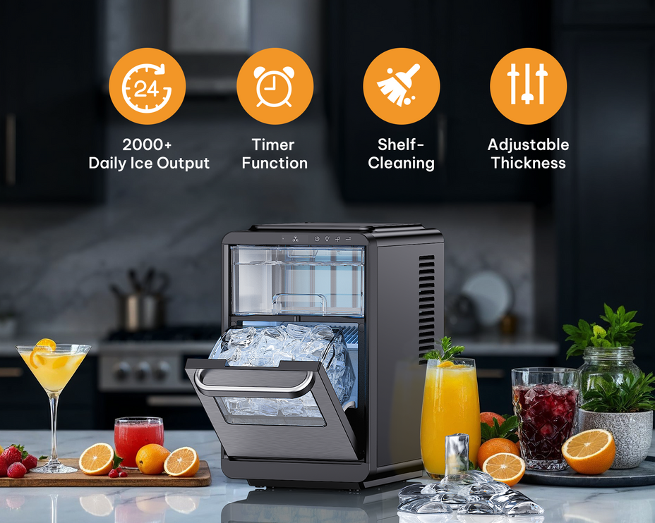 Engineered for heavy daily use, this ice maker delivers over 2,000 cubes every day with consistent clarity and texture. A built-in timer lets you schedule production to match your routine, while the self-cleaning system keeps the interior fresh and maintenance effortless. Customize ice thickness to your exact preference — from crisp, fast-chilling cubes to dense, slow-melting ones — ensuring every batch meets your standards for quality, hygiene, and taste.