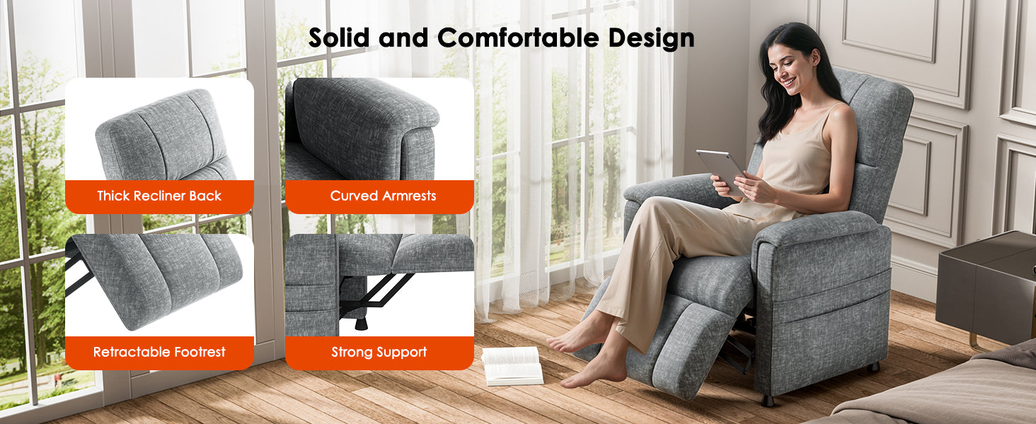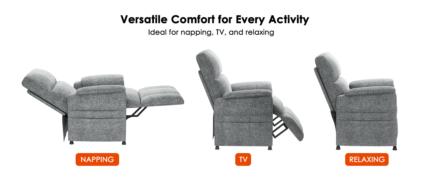 • Durable & Stable – Sturdy steel frame supports up to 300 lbs. Tested for long-term durability, perfect for living rooms, bedrooms, study rooms, or as an RV recliner.